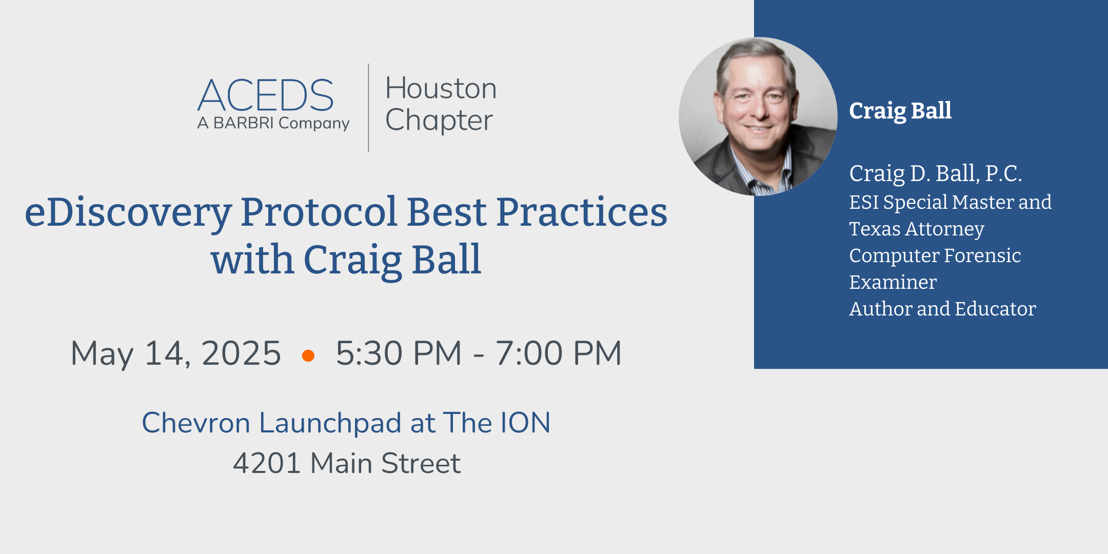 4201 Main St 4201 Main Street, Houston, TX 77002, HoustonCome join the ACEDS Houston Chapter as we join forces with the North and Central Texas Chapters on eDiscovery Day!Join the ACEDS Houston Chapter for dynamic panelist discussions revolving tech innovations and metnods to maintain mental health and wellness in our industry.ACEDS Houston agenda:11:45AM- 12:45 PM Lunch Service 1:15 PM - 1:30 PM Introductory Chapter […]